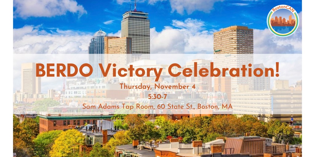 In a ceremony held Tuesday, October 5, at City Hall, Mayor Kim Janey signed what appears to be the most sweeping climate action ordinance in the nation. Boston’s Building Emissions Reduction and Disclosure Ordinance (BERDO) mandates owners of large building to reduce climate-warming emissions 100% by 2050. To celebrate, we invite you to join us on Thursday, Nov. 4, from 5:30 – 7pm, across the street from City Hall at the outdoor, rooftop beer garden “Sam Adams Tap Room,” 60 State St, Boston, MA 02109. (Note that this is not the Sam Adams Brewery in Jamaica Plain.) RSVP for the party here.