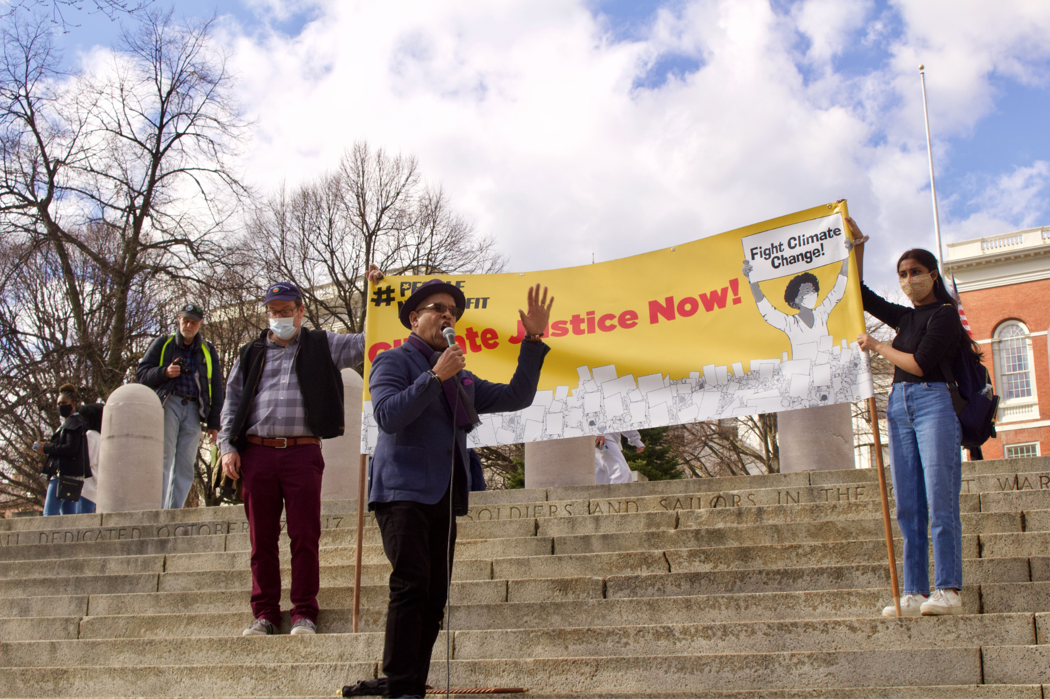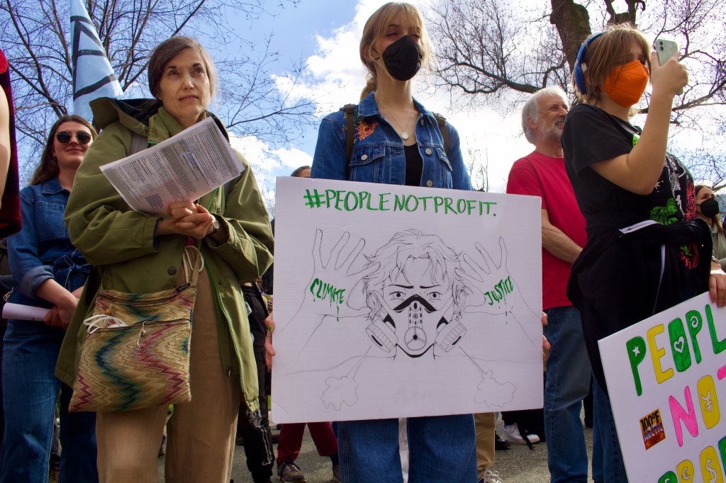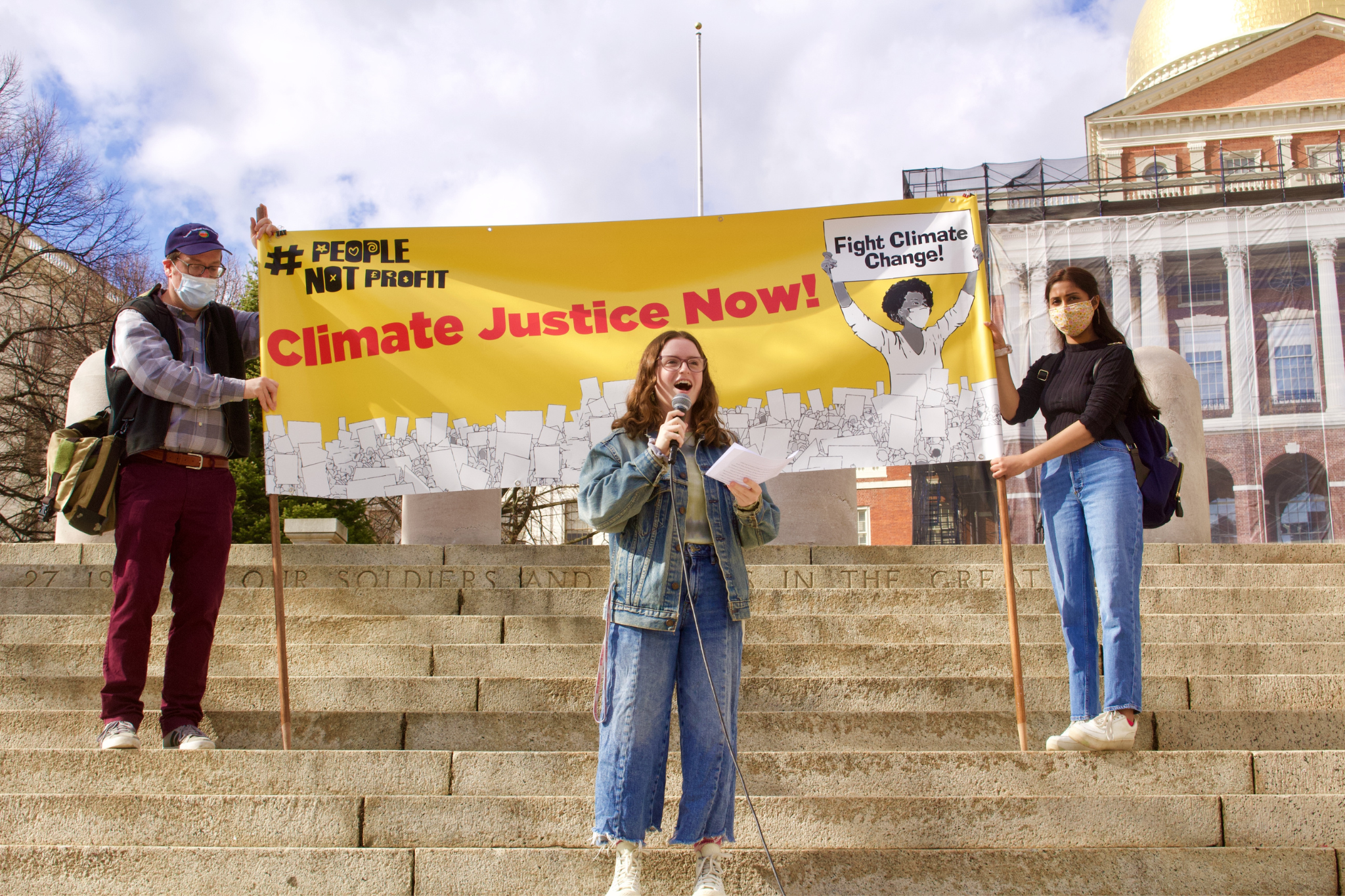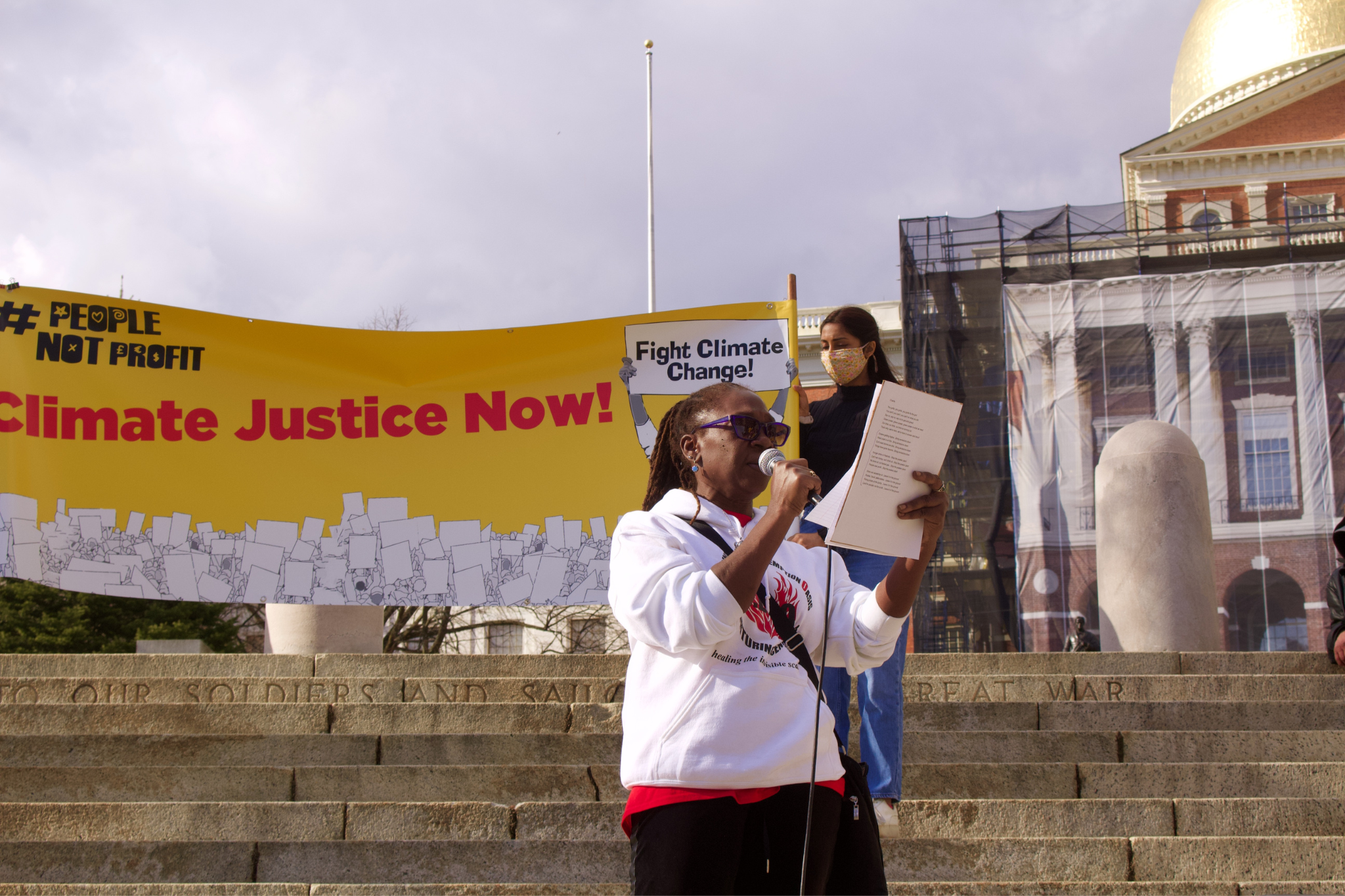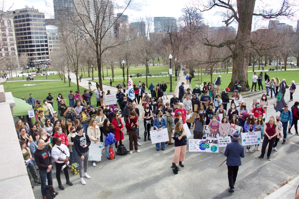 Over 100 climate activists gathered in front of the State House on Friday to take part in the “People, Not Profit” climate strike with Fridays For Future Massachusetts, demanding Gov. Charlie Baker and the Boston City Council take urgent action to combat the intersecting crises of racism, economic and energy injustice, housing and climate changes.