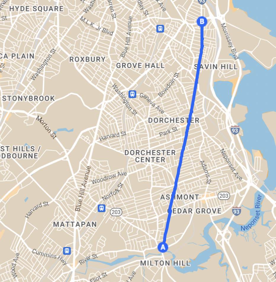 The parade will step off at Dorchester Avenue at Lower Mills (Point A on the map). We’ll gather at Mike Prokosch’s house at 12:45 PM and then head down together. (RSVP for Mike’s address) The parade will run along Dorchester Avenue to Columbia Road @ Dorchester Avenue (Point B on the map).